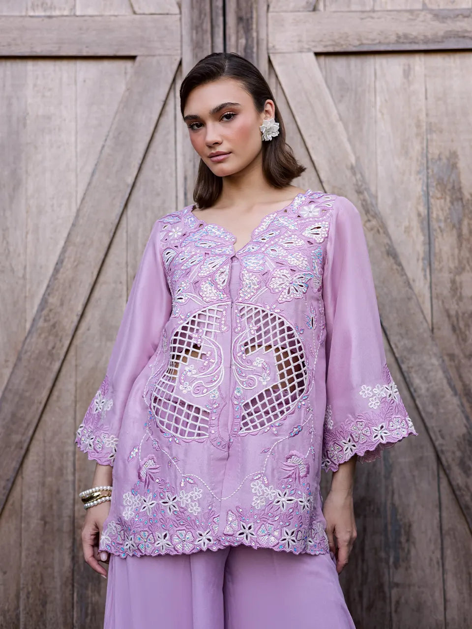 A statement in refined festivity, this blush pink ensemble features a delicately crafted cutwork jacket adorned with intricate threadwork and subtle sequin embellishments for a soft, luminous finish. Tailored in pure raw silk, the jacket offers structure with elegance, while the crepe silk shararah pants — finished with a smooth lining — create graceful movement and fluidity. A perfect balance of texture and silhouette, designed for elevated celebratory dressing.