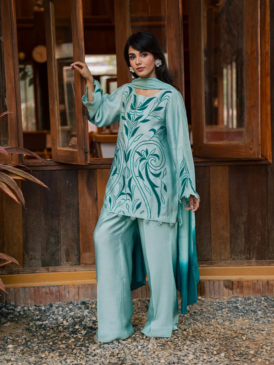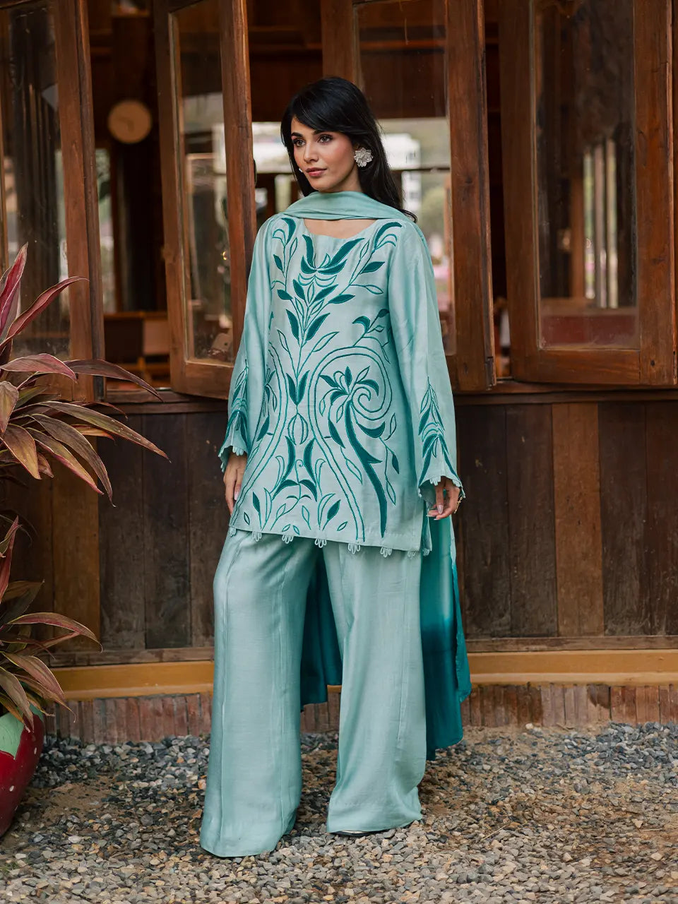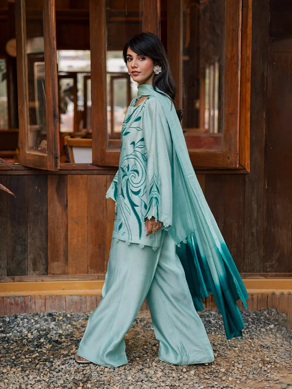 A Khaadi silk kurta and pants ensemble, detailed with elegant embroidery and appliqué accents on the shirt and sleeves, paired with a softly shaded cotton silk dupatta.