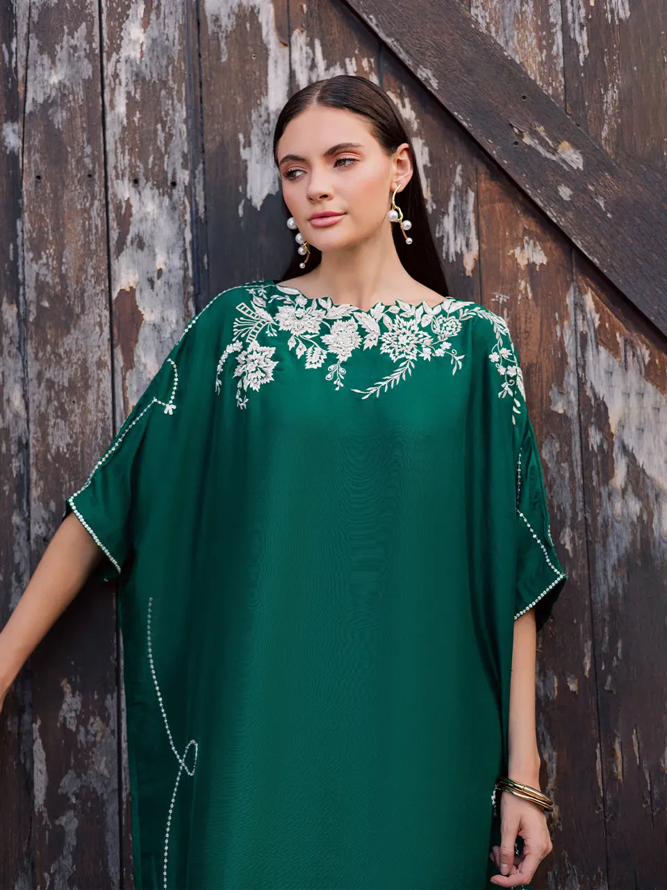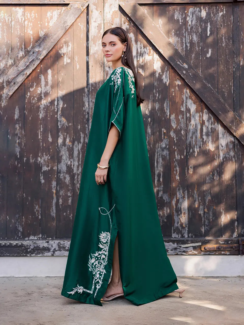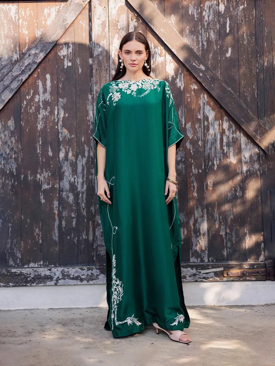 Cut from pure raw silk in a striking emerald green hue, this kaftan exudes understated luxury. Delicately adorned with intricate threadwork and subtle diamanté embellishments, it catches the light with effortless elegance. The fluid silhouette drapes beautifully, making it a refined statement piece perfect for festive soirées and evening celebrations.