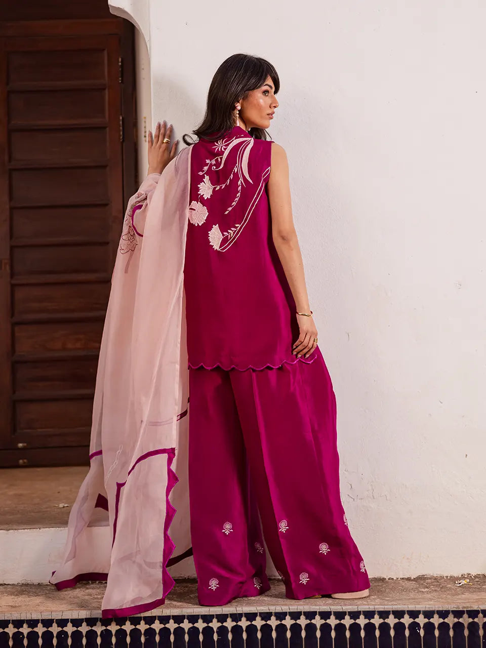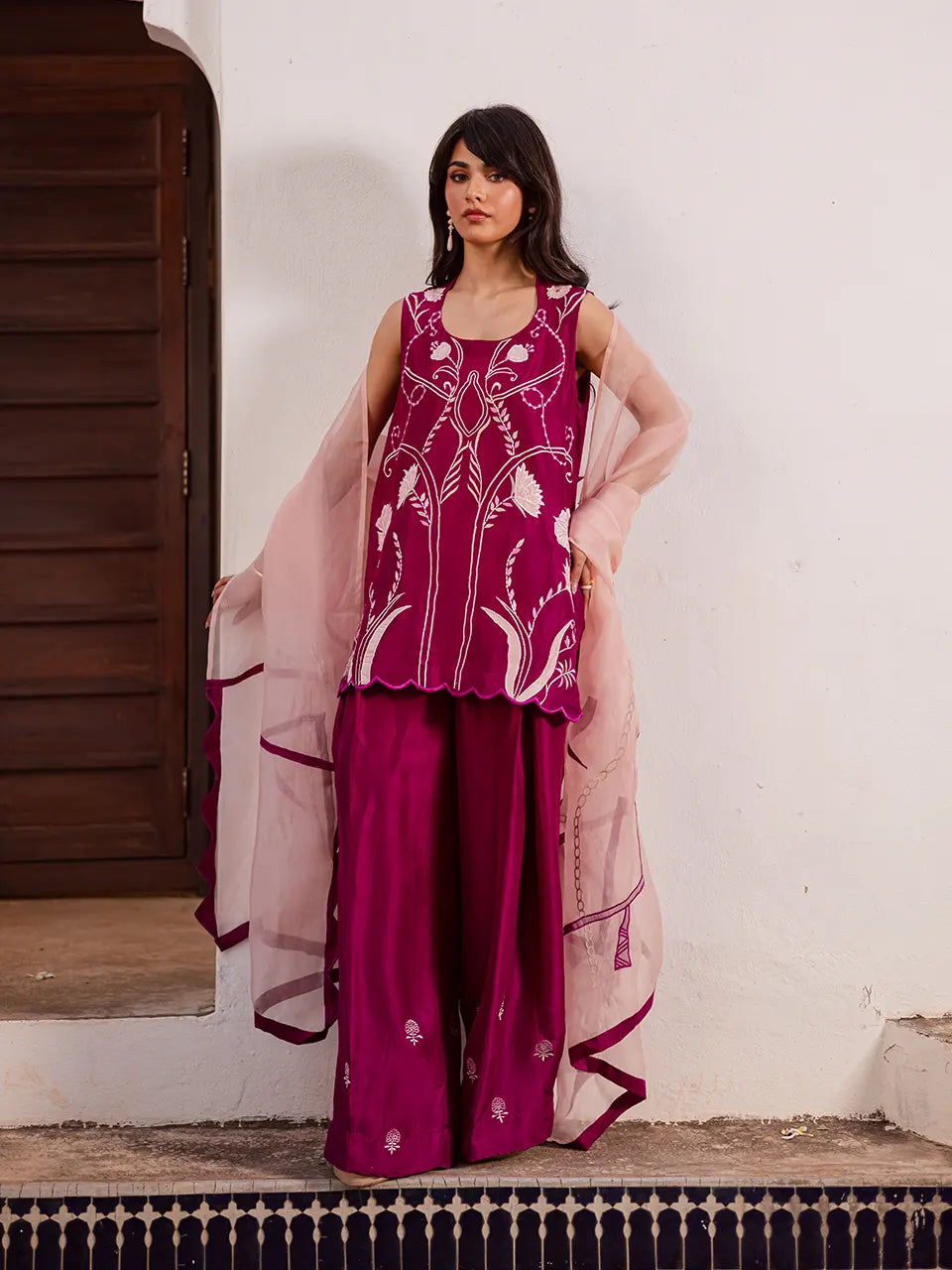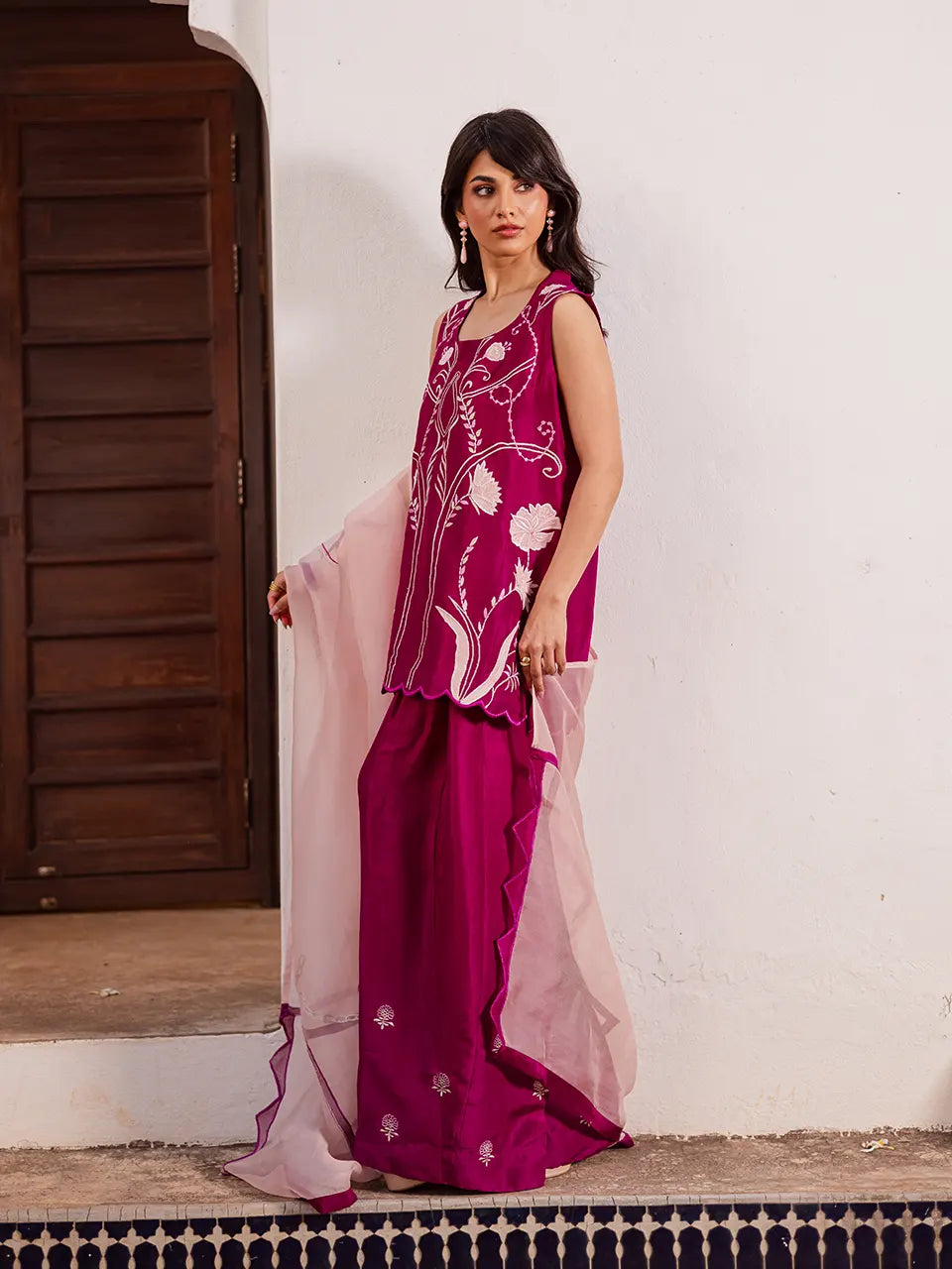 A fuchsia pink embroidered and appliqué-worked shirt with a matching shalwar, paired with an organza dupatta detailed with delicate embroidery. Sleeves can be added.