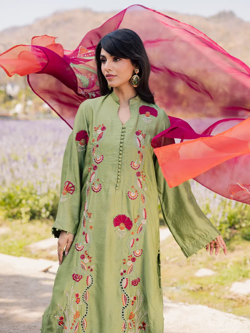 An olive green outfit adorned with embroidery and appliqué detailing, paired with flared pants and a maroon appliqué-worked dupatta.