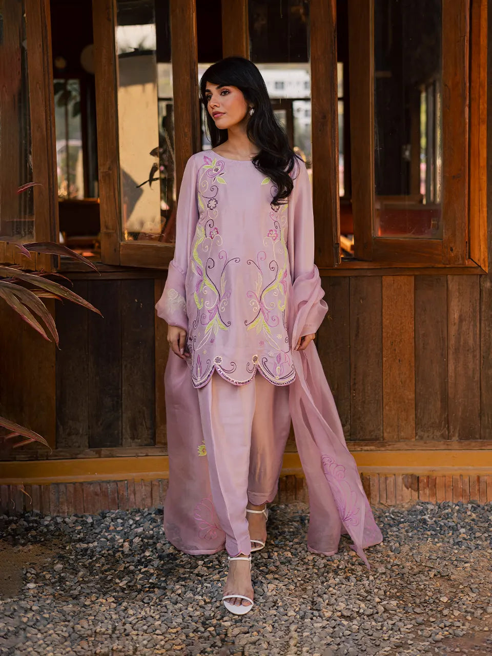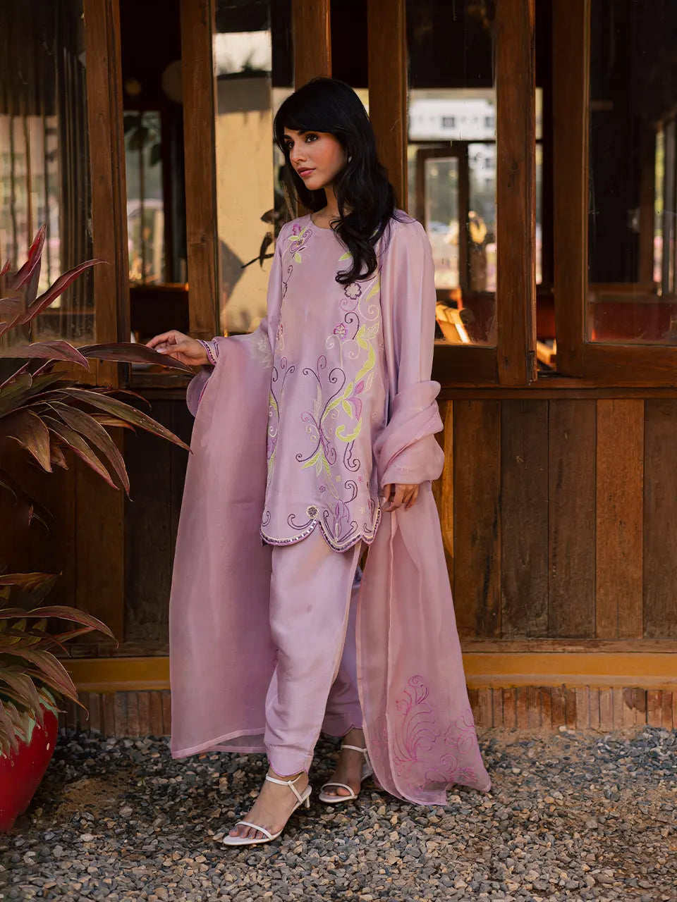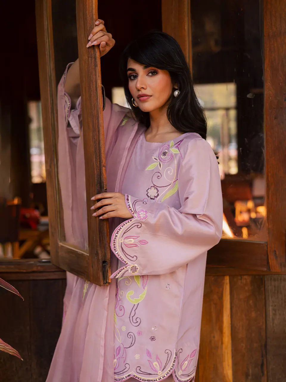 A raw silk kurta brought to life with appliqué embroidery and mirror work, paired with tapered shawls and an embroidered dupatta to complete the look.