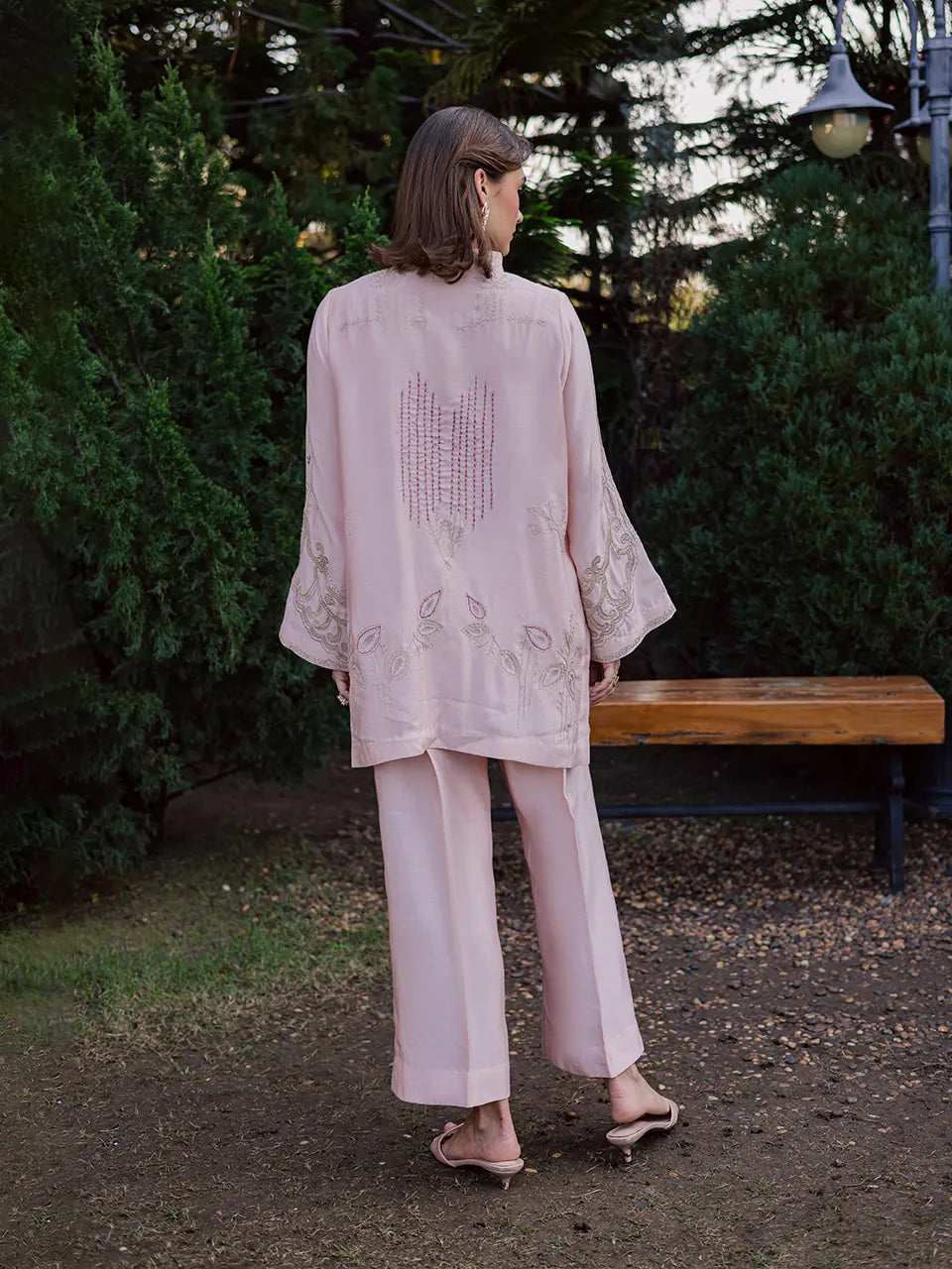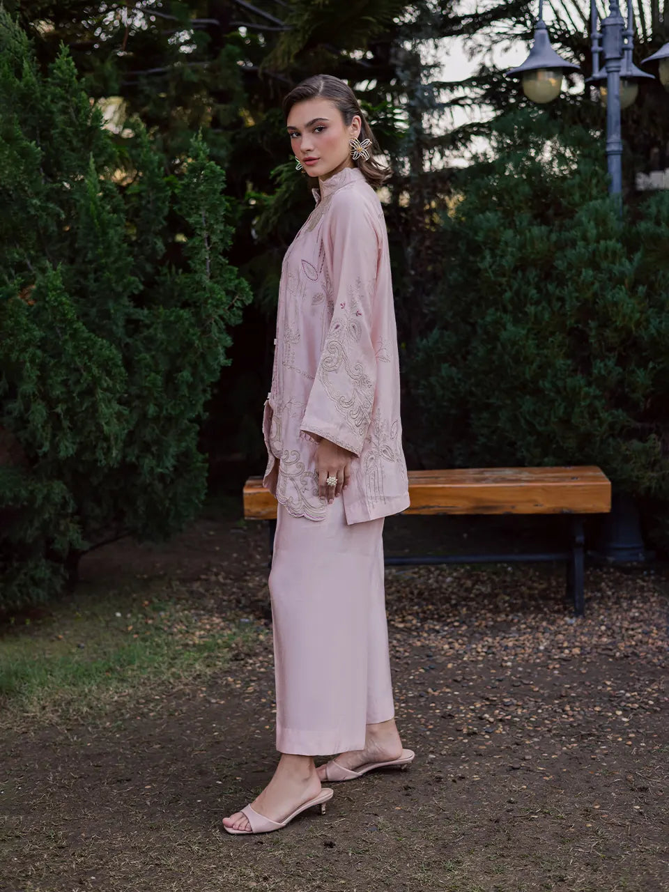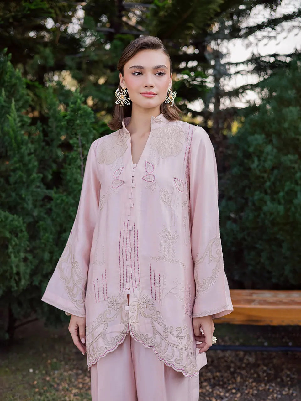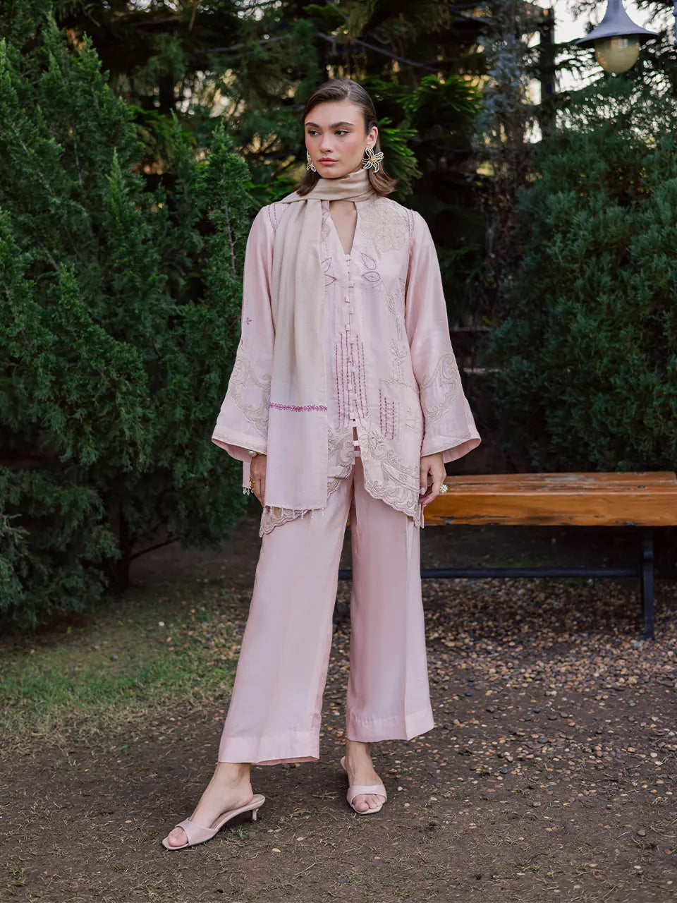 Rendered in a soft pinkish-peach hue, this pure Khaadi silk kaftan is delicately adorned with intricate threadwork, lending texture and refined detail to its fluid silhouette. Paired with a contrasting cotton silk scarf, the ensemble strikes a beautiful balance between subtle elegance and statement layering — perfect for effortless festive styling.