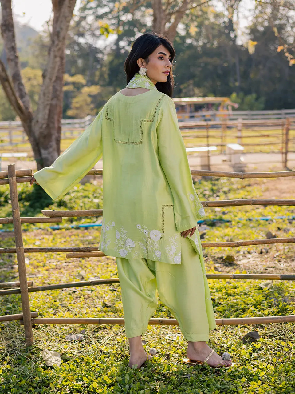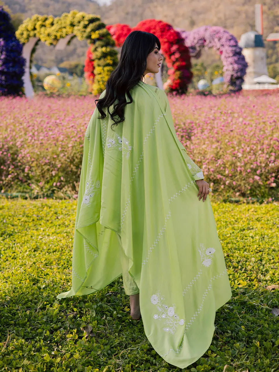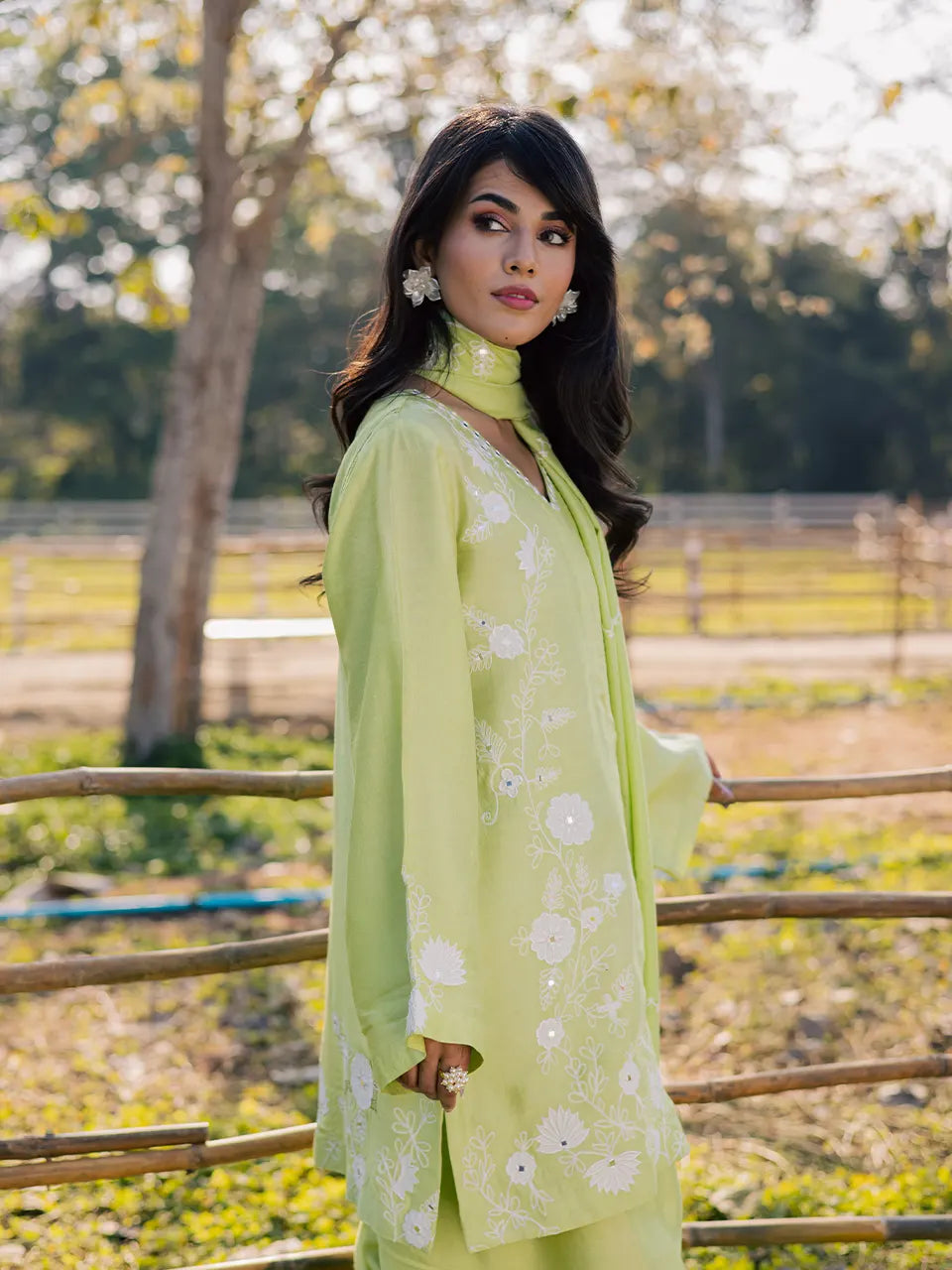 A Greek khaadi silk ensemble detailed with embroidery, mirror, and appliqué work, complete with a skinny shalwar and an embroidered dupatta.
