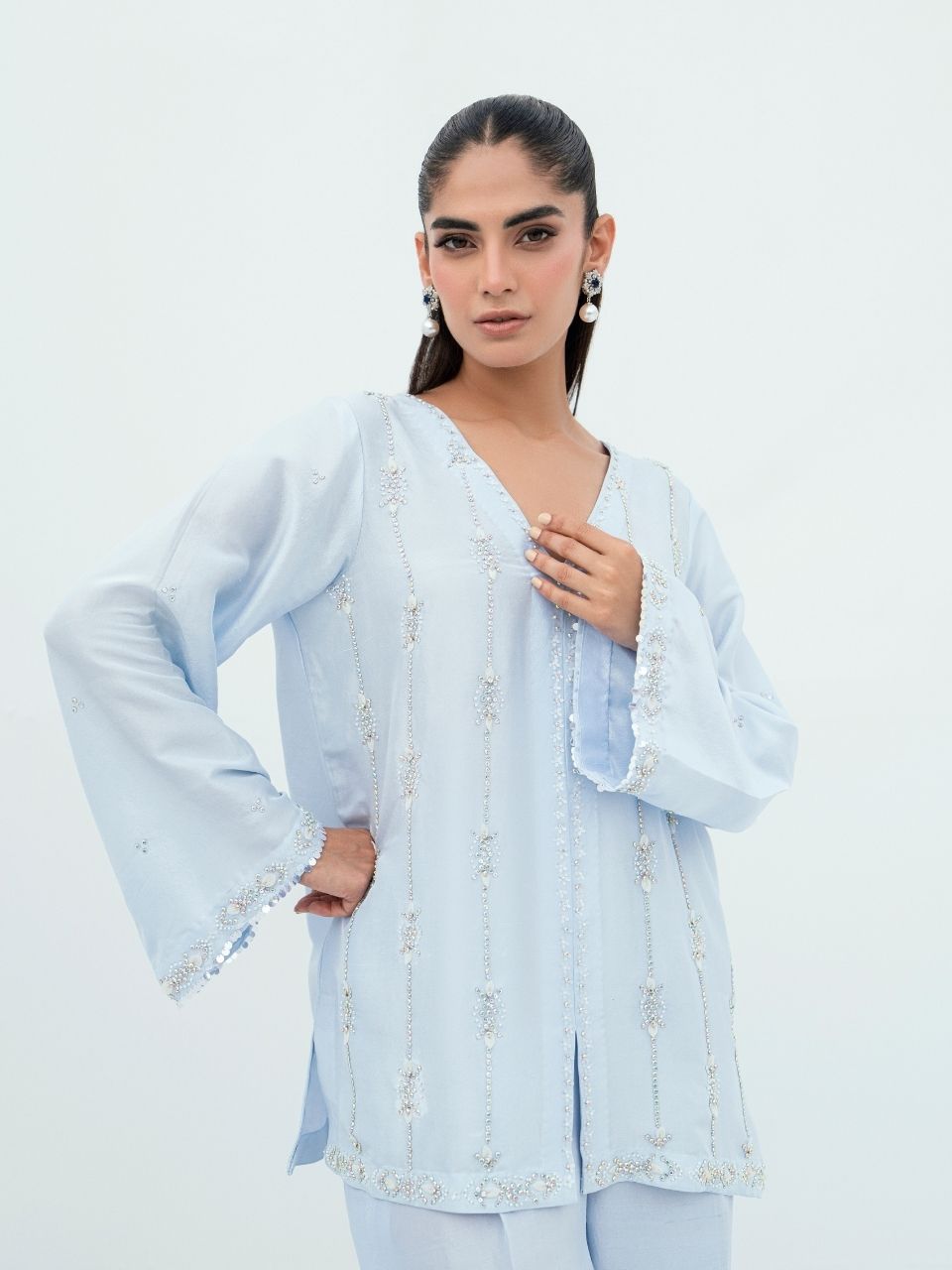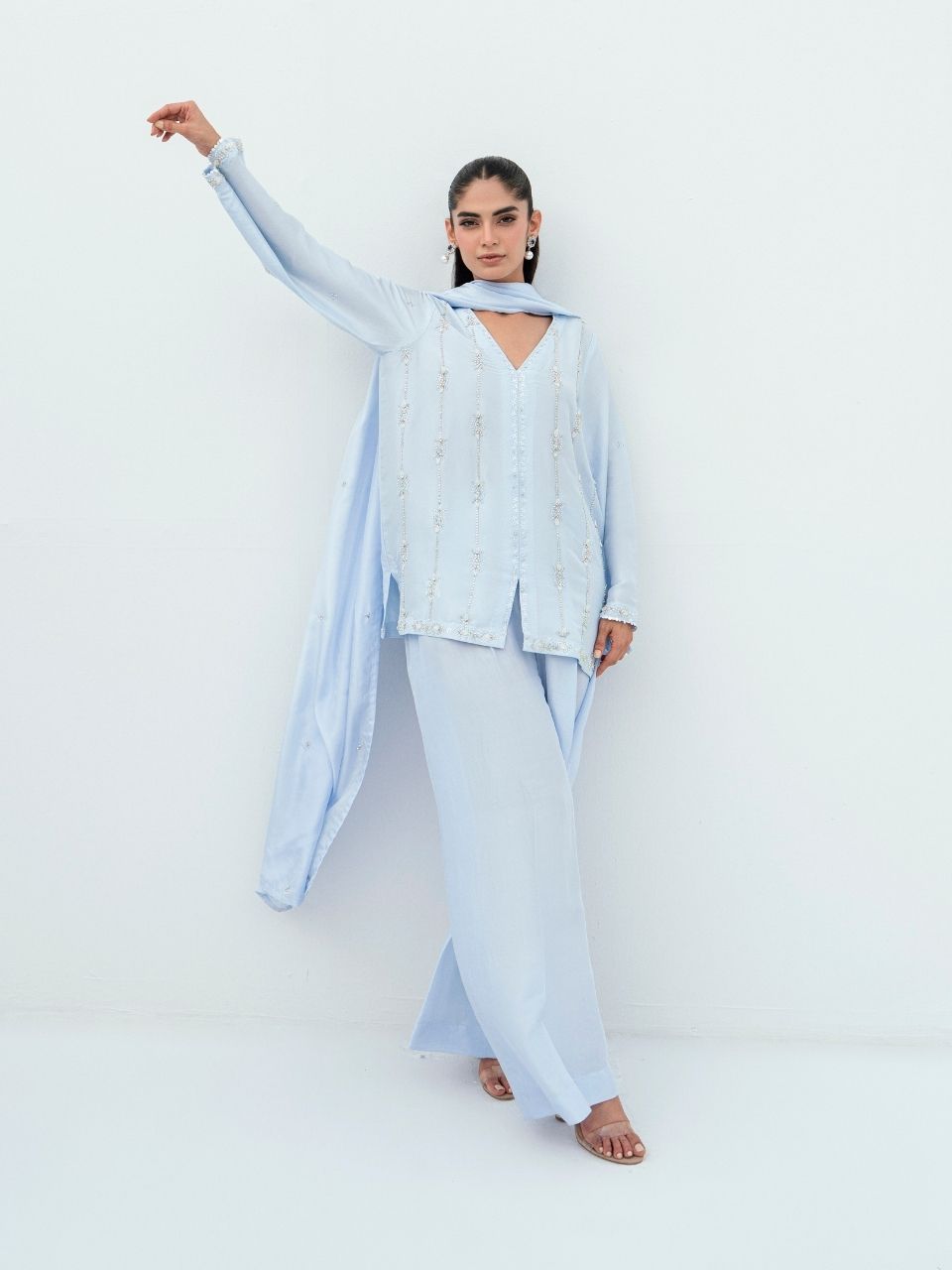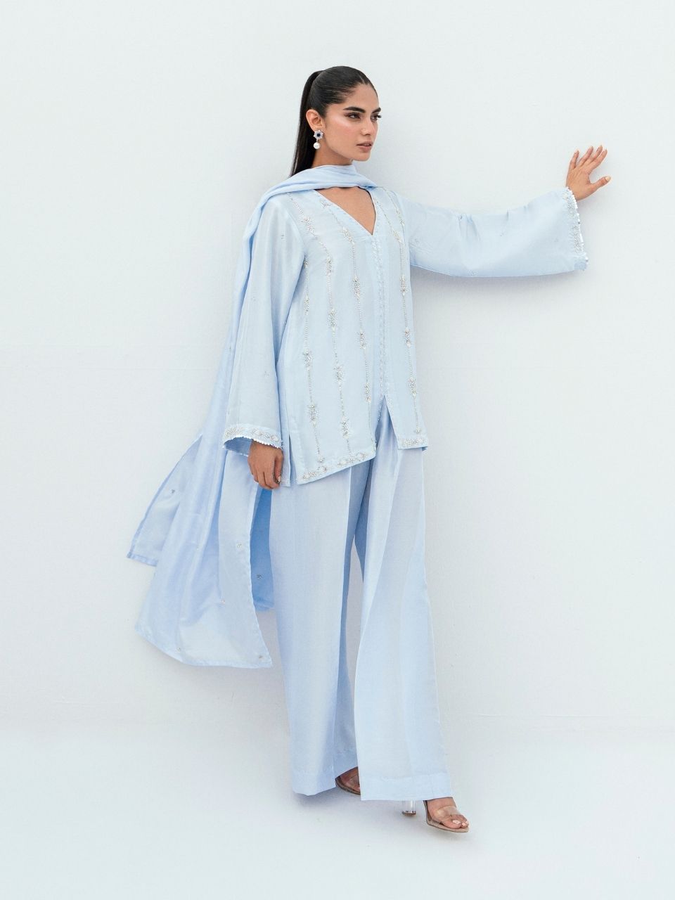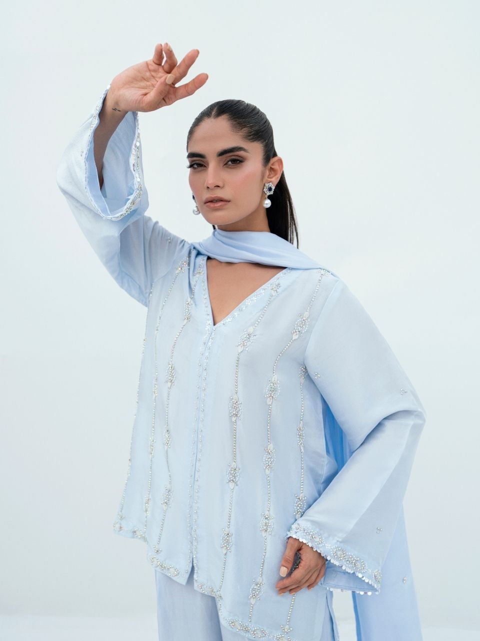 Ice blue top with gorgeous hand work dimaonte details paired with flaired pants and silk duppatta with chan.