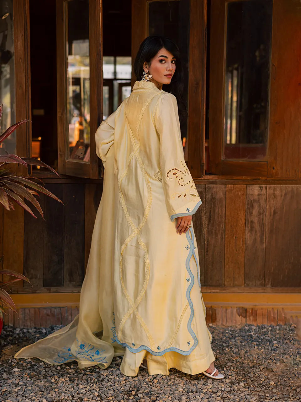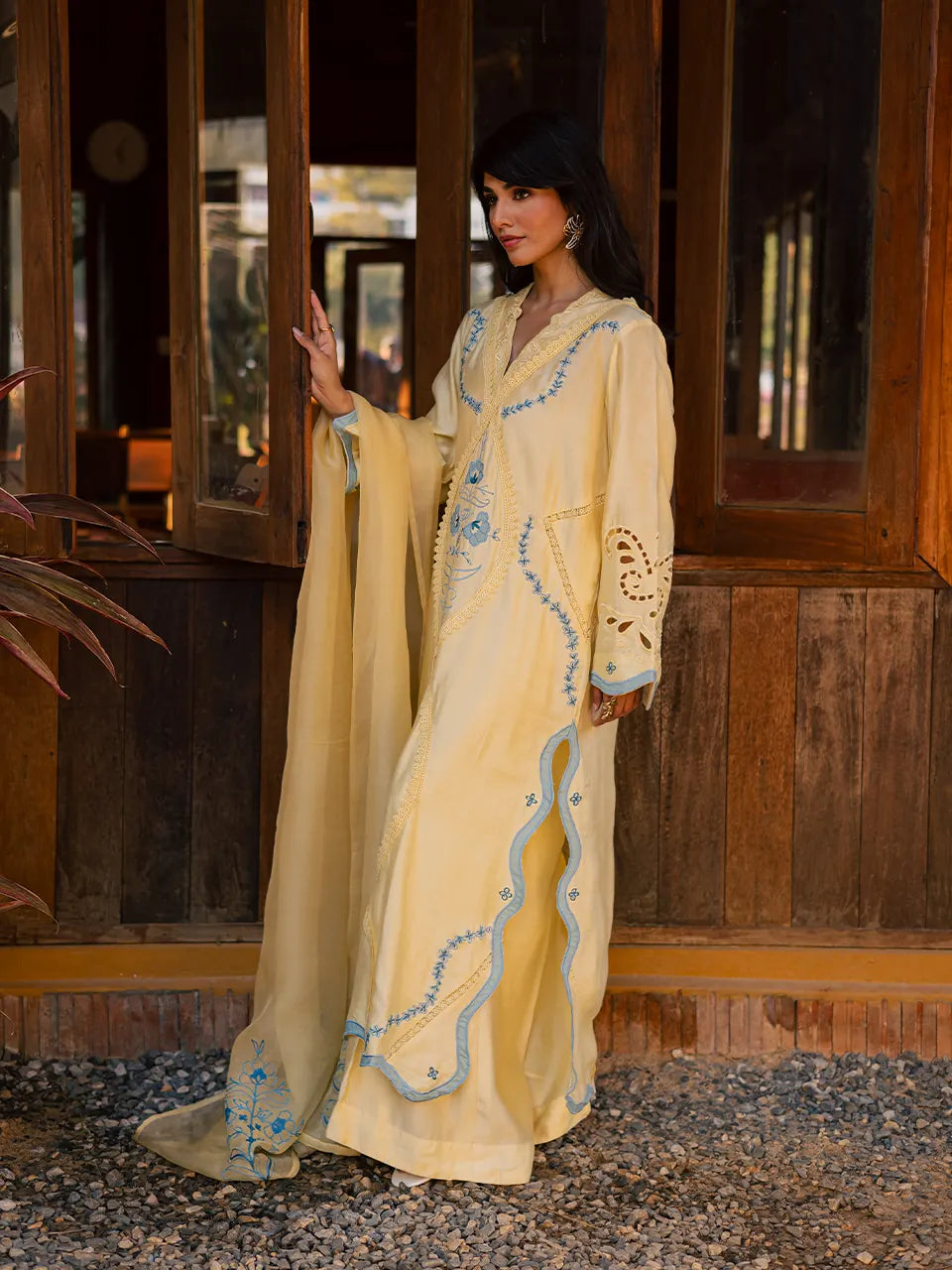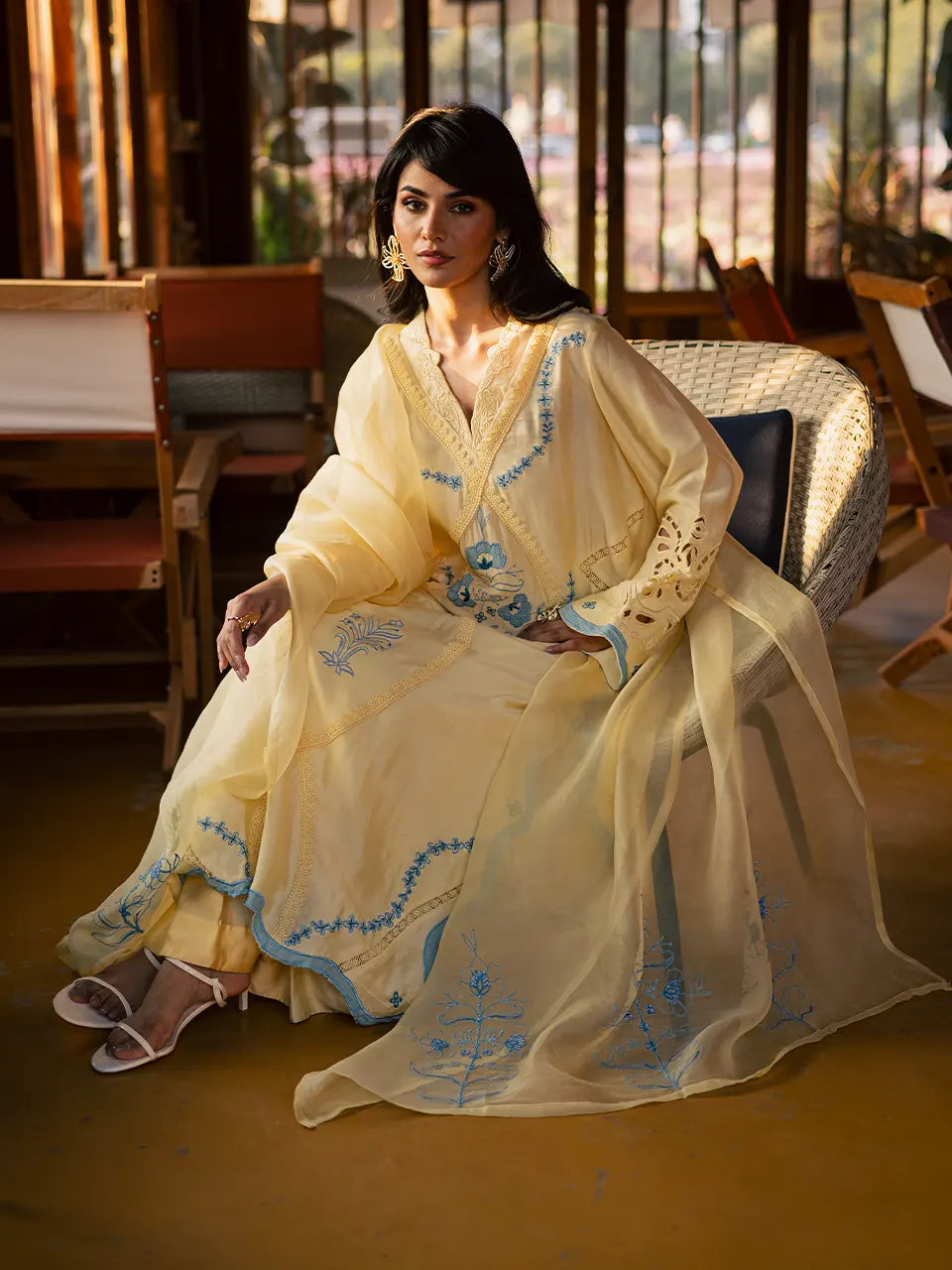 Crafted in Khaadi silk, this yellow outfit features intricate blue appliqué and embroidery, styled with flared pants and a delicately embroidered organza dupatta.