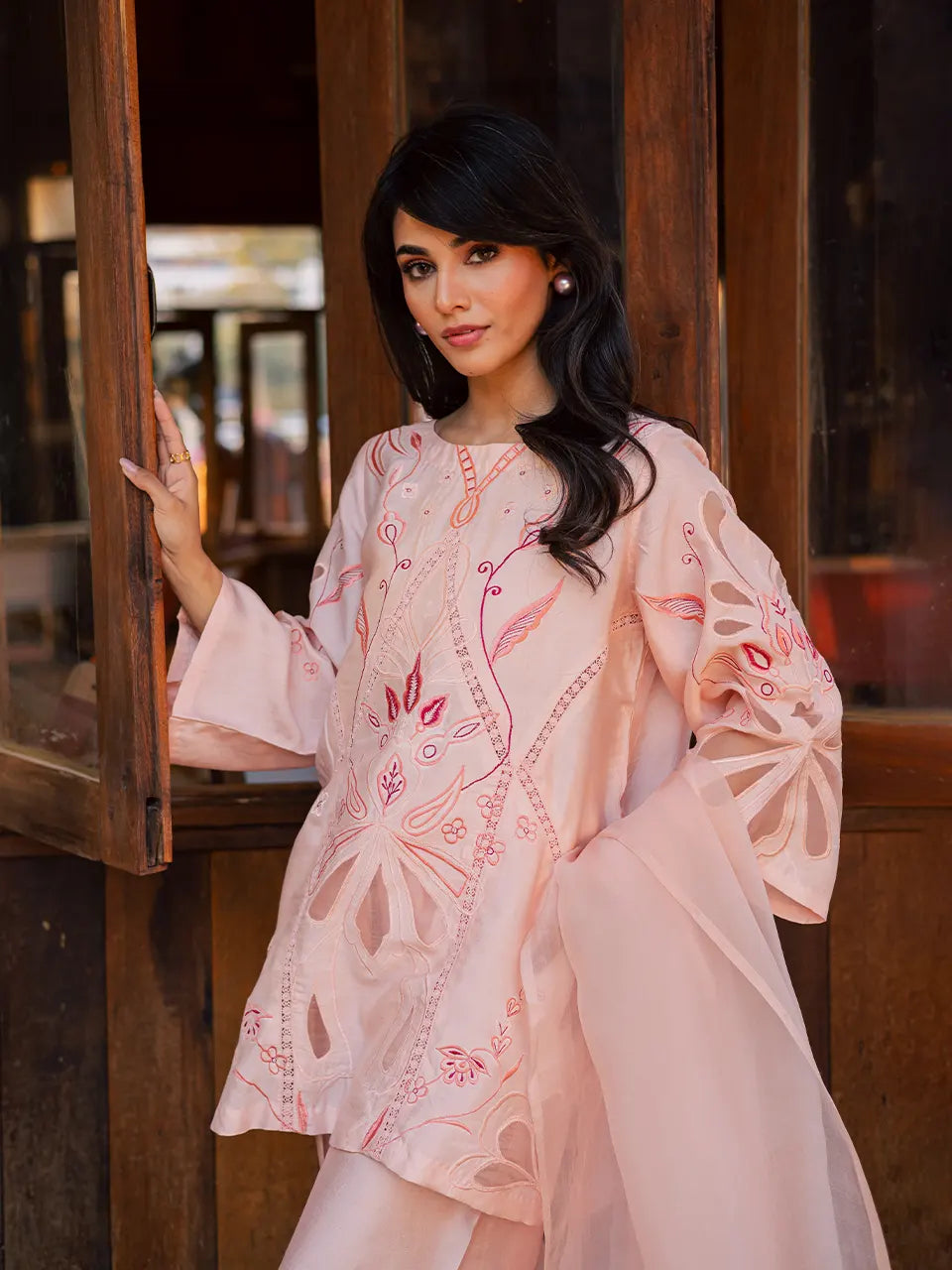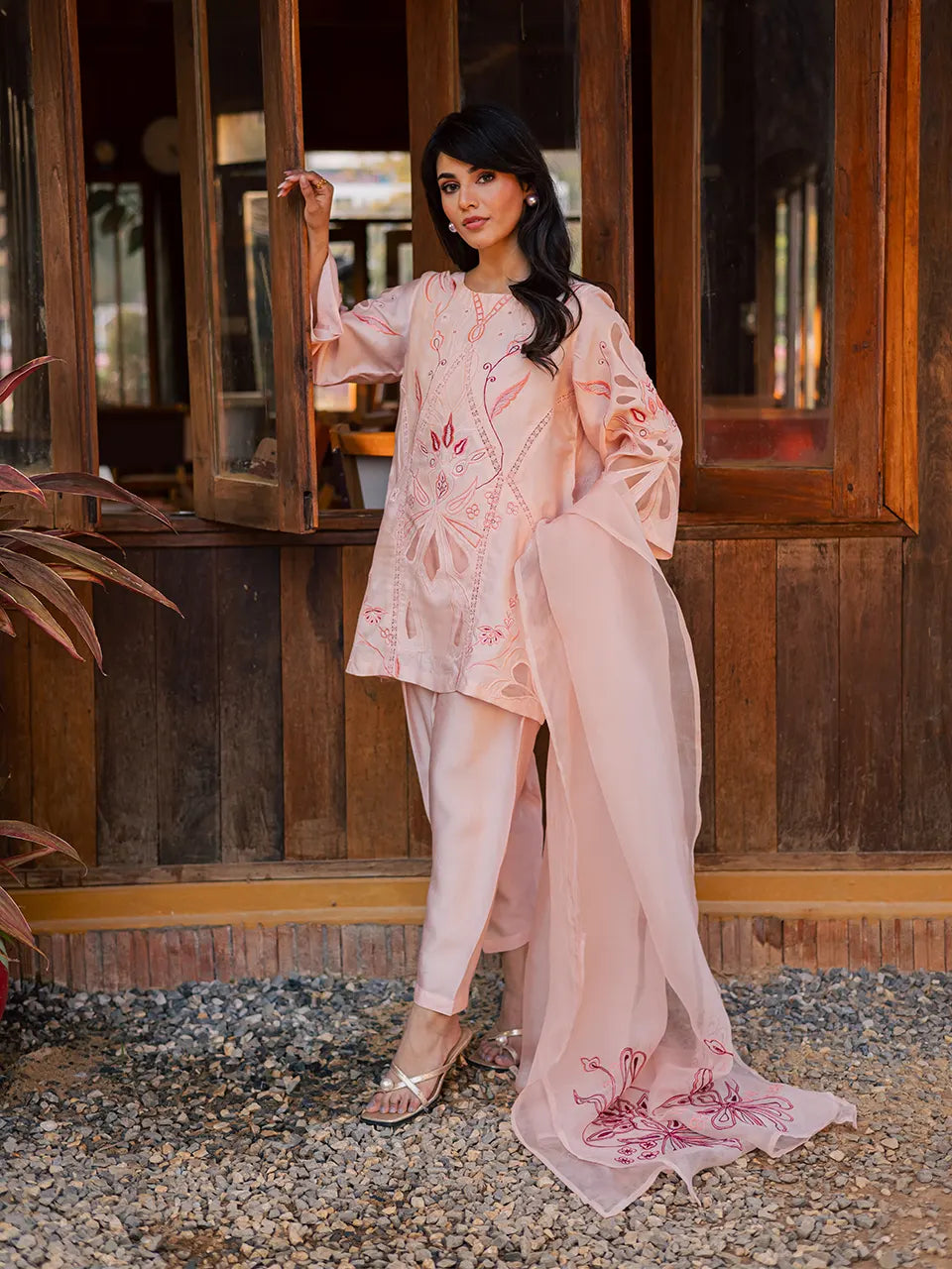 Crafted in Khaadi silk, this outfit features appliqué and embroidered detailing, styled with a tapered shalwar and an embroidered organza dupatta.