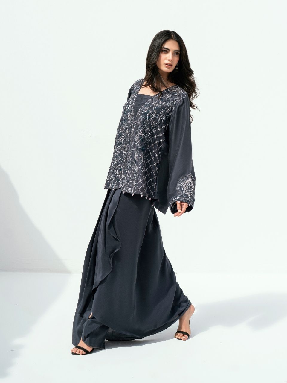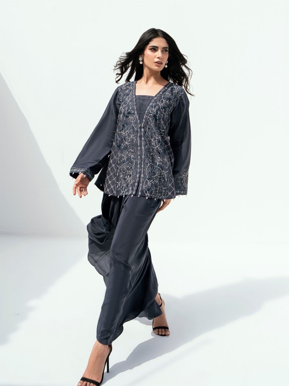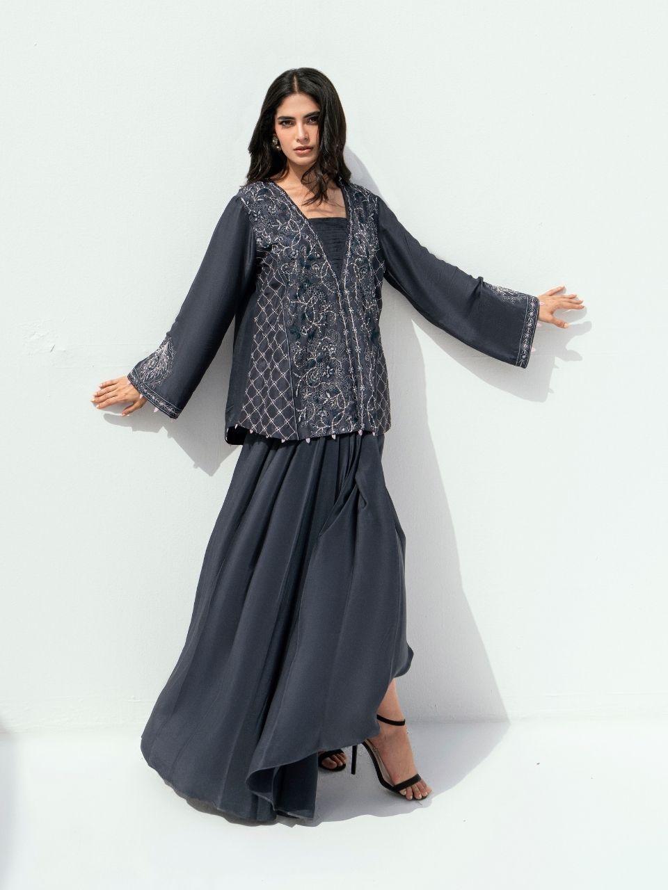 Grey jacket with intricate embroidery details and pearl handwork details paired with a draped skirt.