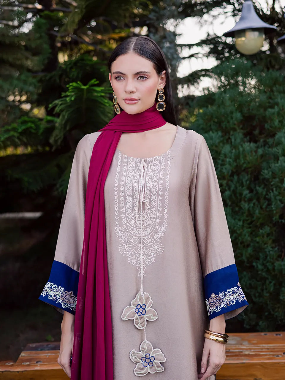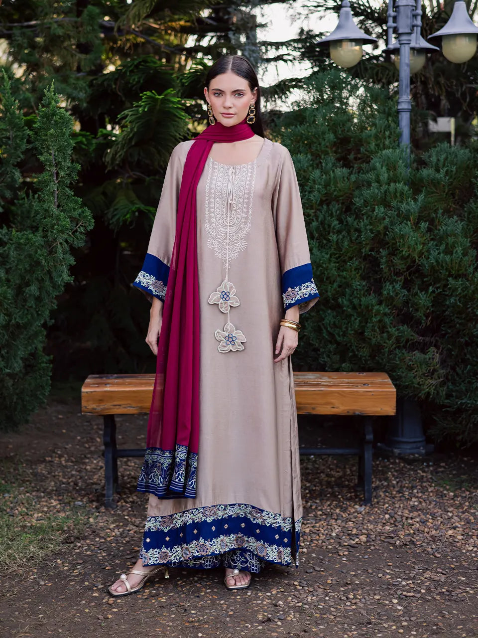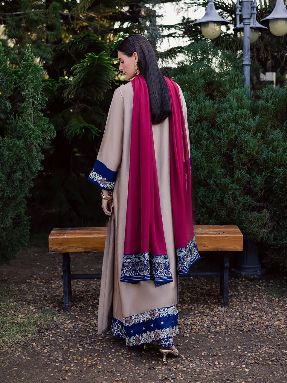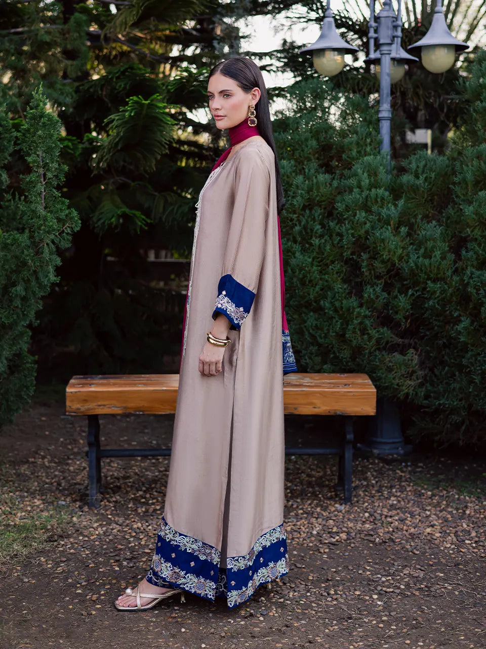 Rendered in a rich mocca tone, this Khaadi silk kaftan features a striking contrast navy border adorned with intricate threadwork, adding depth and definition to its fluid silhouette. Paired with coordinating embroidered Khaadi silk pants for a cohesive finish, the look is completed with a lightweight chiffon georgette dupatta in maroon, lending softness and graceful movement. A refined ensemble designed for effortless festive elegance.